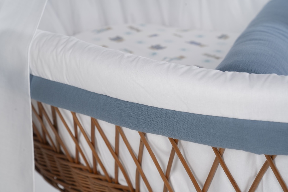 Die Kombination mit dem vollständigen textilen Set aus weicher Bio-Baumwolle schafft ein harmonisches Design. Der fließende Stoff des Himmels sorgt für gedämpftes Licht und eine ruhige Schlafatmosphäre, die Wattierung des Polsters schützt vor dem Anstoßen. Das Set ist somit genau auf die Bedürfnisse des Säuglings abgestimmt und wird komplett in unserer Manufaktur in Deutschland entworfen und gefertigt.